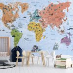 Çocuklar için Hayvanlı ve Anıtlı Dünya Haritası Duvar Kağıdı