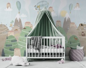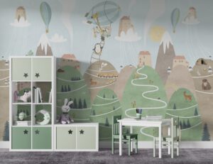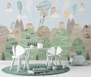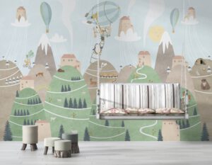 Doğa ile iç içe bir yaşamı keşfedin! Bu dağ köyü temalı duvar kağıdı, sevimli hayvanlar ve eğlenceli karakterlerle dolu. Bisiklete binen karakterler, balonlarla uçan evler ve dağ manzaraları ile çocuk odalarına huzur ve neşe katın. Kendinden yapışkanlı veya geleneksel seçenekler mevcut.