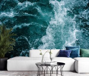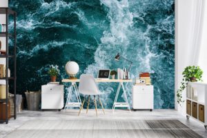Bu derin okyanus dalgası temalı duvar kağıdı, odanıza ferahlatıcı ve canlı bir atmosfer katıyor. Canlı turkuaz ve beyazın birleşimi, modern iç mekanınıza doğal bir dokunuş ekliyor. Deniz severler için mükemmel bir dekoratif seçim.