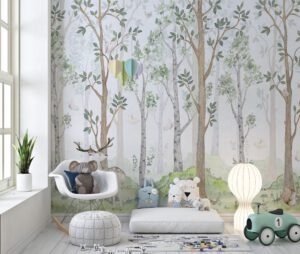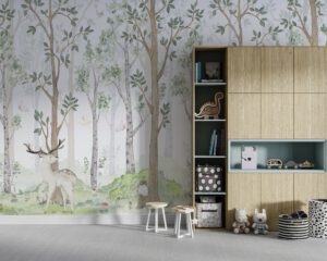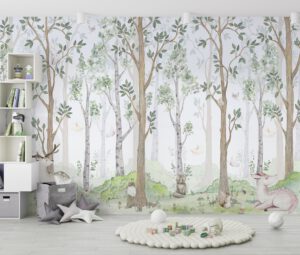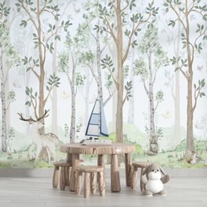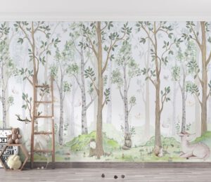 Doğanın ve yaban hayatının huzur veren manzarasını odanıza taşıyın! Orman manzarası, ağaçlar ve doğal yaşamla tasarlanmış bu duvar kağıdı, çocuk odanızda sakin ve doğal bir atmosfer yaratacak. Kendinden yapışkanlı veya geleneksel seçenekler mevcut.