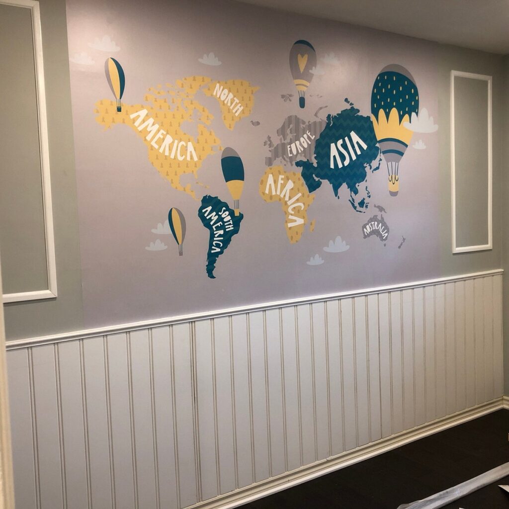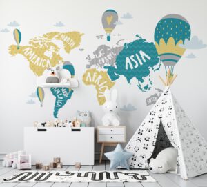 Bu eğlenceli ve renkli dünya haritası duvar kağıdı, çocuk odalarına eğitimsel bir dokunuş katıyor. Kuzey ve Güney Amerika, Avrupa, Asya, Afrika gibi kıtaların şık bir şekilde yer aldığı tasarımda sıcak hava balonları ve bulutlar da dikkat çekiyor. Kendinden yapışkanlı veya geleneksel uygulama seçenekleri ile sunulmaktadır.