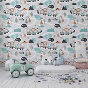 Çocuğunuzun odasını sevimli hayvanların neşeli tren yolculuğuna çıkardığı bir maceraya davet edin! Bu özel tasarım çocuk duvar kağıdı, sevimli bir filin sürdüğü, aslan ve kaplan gibi dost canlısı hayvanları taşıyan renkli bir treni ve etrafındaki dağlar, ağaçlar, minik gökkuşakları ve bulutlarla dolu bir manzarayı konu alır. Orta gri zemin üzerine canlı turuncu, mavi ve siyah tonlarıyla tasarlanan bu desen, ‘Hello’ diyen konuşma balonlarıyla miniklere neşeyle merhaba der ve hayal güçlerini harekete geçirir.