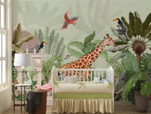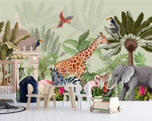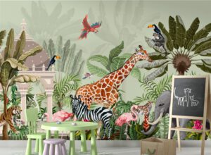 Zürafa, zebra, fil, kaplan, flamingo ve tukan kuşları gibi egzotik hayvanlarla süslenmiş bu modern safari temalı duvar kağıdı, çocuk odalarına ve oyun alanlarına doğal ve macera dolu bir atmosfer katıyor. Tropikal bitkiler ve egzotik tapınak detaylarıyla tasarım zenginleştirilmiştir. Ürün, hem kendinden yapışkanlı hem de geleneksel tutkal ile uygulanabilir seçeneklerde sunulmaktadır. Çocuk odaları, oyun odaları ve anaokulları için mükemmel bir tercihtir.