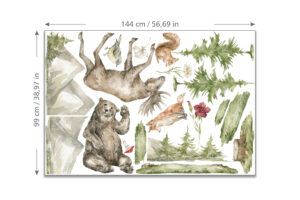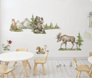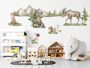 Doğanın büyüleyici güzelliğini ve yaban hayatının görkemini duvarlarınıza taşıyın! Görkemli Yaban Hayatı Duvar Sticker Seti, detaylı ve gerçekçi suluboya çizimleriyle yaşam alanlarınıza sanatsal bir dokunuş ve huzurlu bir atmosfer katacak. Bu özel set; heybetli bir ayı, zarif bir mus (Amerika geyiği), kurnaz bir tilki, sevimli bir sincap ve minik bir kuşun yanı sıra, dağlar, çam ağaçları ve kır çiçekleri gibi doğal unsurları içerir. Her bir figür, odanıza derinlik ve doğal bir estetik katmak için özenle tasarlanmıştır.