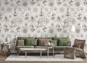 Gri ve bej tonlarında tasarlanmış bu vintage deniz temalı duvar kağıdı, mekanlarınıza şık ve doğal bir marin havası katıyor. Pusula, çapa, yelkenli gemi ve deniz feneri gibi ikonik deniz figürleriyle bezeli bu tasarım hem kendinden yapışkanlı hem de geleneksel tutkal ile uygulanabilir seçeneklerde sunulmaktadır. Salonlar, ofisler, çalışma odaları ve yazlık ev dekorasyonları için mükemmel bir tercihtir.