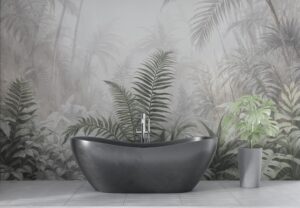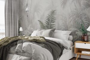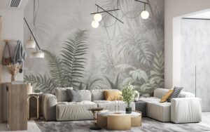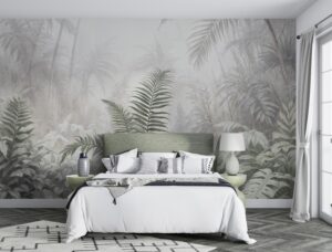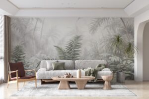Evinize veya ofisinize modern ve sakin bir kaçış noktası yaratın! Bu etkileyici gri ve yeşil tonlardaki tropikal orman desenli duvar kağıdı, mekanlarınıza derinlik ve sofistike bir doğallık katar. Sisli bir orman atmosferini yansıtan palmiye ağaçları, eğrelti otları ve çeşitli tropik yaprakların zarif silüetleri, duvarlarınızı adeta yaşayan bir sanat eserine dönüştürür. Bu büyük ölçekli tasarım, özellikle salon, yatak odası veya modern çalışma alanları için dingin ve huzurlu bir ortam yaratmak üzere idealdir.