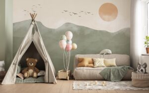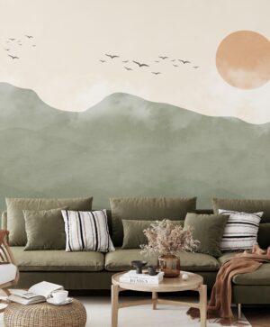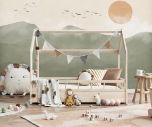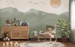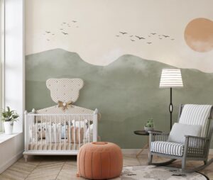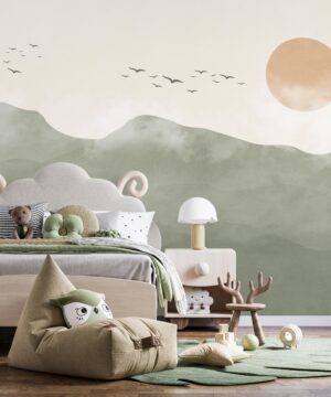 Çocuğunuzun odasına İskandinav esintili, huzurlu bir doğa atmosferi taşıyın! Bu modern duvar kağıdı, yumuşak adaçayı yeşili tonlarındaki katmanlı dağ silüetleri, sıcak terracotta rengi bir güneş ve özgürce uçan kuş figürleriyle minimalist ve sakin bir manzara sunar. Çocuğunuzun hayal gücünü besleyecek, odasına dinginlik ve ferahlık katacak bu zarif tasarım, özellikle Montessori ve İskandinav tarzı dekore edilmiş çocuk odaları için mükemmel bir tamamlayıcıdır.