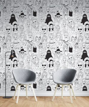 Kadın Figürlü Siyah Beyaz Çizgisel Duvar Kağıdı