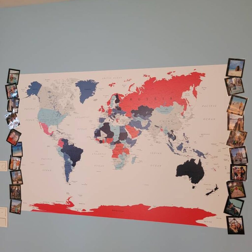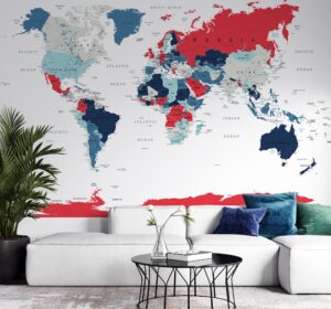 Kırmızı ve mavi tonların çarpıcı uyumuyla tasarlanmış bu modern dünya haritası duvar kağıdı, mekanlarınıza dinamik ve enerjik bir atmosfer kazandırır. Ülkeler ve şehirler detaylı bir şekilde gösterilmiştir. Kendinden yapışkanlı vinil veya tutkallı geleneksel malzeme seçenekleri ile kolayca uygulanabilir. Ofis, çalışma odası, salon ve genç odası gibi mekanlar için mükemmeldir. Yüksek çözünürlüklü baskı kalitesine sahiptir ve özel ölçülerde üretim yapılabilir.