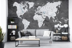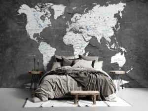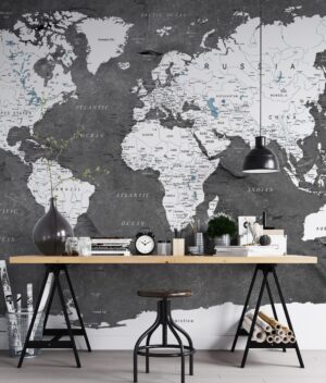 Koyu beton doku zemin üzerinde siyah beyaz dünya haritası tasarımıyla hazırlanmış bu duvar kağıdı, endüstriyel ve modern tarzda dekorasyon isteyenler için mükemmel bir seçenektir. Ülkeler ve şehirler detaylı bir şekilde gösterilmektedir. Kendinden yapışkanlı vinil veya tutkallı geleneksel malzeme seçenekleriyle kolayca uygulanabilir. Yatak odası, salon, ofis, çalışma odası ve loft tarzı mekanlar için idealdir. Yüksek çözünürlüklü baskı kalitesi ve isteğe özel ölçü üretim imkanı sunulmaktadır.