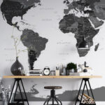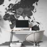Koyu beton doku zemin üzerinde siyah beyaz dünya haritası tasarımıyla hazırlanmış bu duvar kağıdı, endüstriyel ve modern tarzda dekorasyon isteyenler için mükemmel bir seçenektir. Ülkeler ve şehirler detaylı bir şekilde gösterilmektedir. Kendinden yapışkanlı vinil veya tutkallı geleneksel malzeme seçenekleriyle kolayca uygulanabilir. Yatak odası, salon, ofis, çalışma odası ve loft tarzı mekanlar için idealdir. Yüksek çözünürlüklü baskı kalitesi ve isteğe özel ölçü üretim imkanı sunulmaktadır.