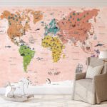 Pembe Arka Planlı Hayvanlı ve Anıtlı Dünya Haritası Duvar Kağıdı