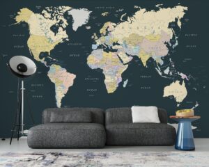 Koyu lacivert arka planı ve pastel tonlu ülke renkleriyle tasarlanmış bu dünya haritası duvar kağıdı, mekanlarınıza zarif ve modern bir hava kazandırır. Ülkeler ve şehirler detaylı bir şekilde gösterilmiştir. Kendinden yapışkanlı vinil veya tutkallı geleneksel malzeme seçenekleri ile kolay kurulum sağlar. Salonlar, ofisler, çalışma odaları ve otel lobileri için ideal bir dekorasyon ürünüdür. Yüksek çözünürlüklü baskı kalitesi ile isteğe özel ölçülerde üretim yapılabilmektedir.