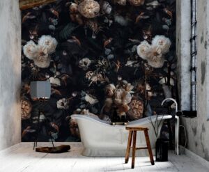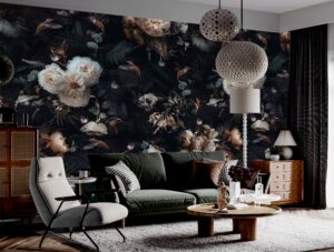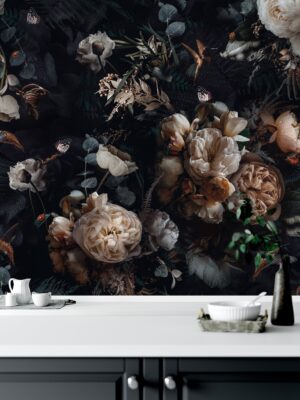 Evinize veya iş yerinize dramatik ve sofistike bir hava katacak bu göz alıcı koyu renk botanik çiçekli duvar kağıdı ile tanışın. Siyah fon üzerine ustaca yerleştirilmiş krem, bej ve soluk pembe tonlarındaki büyük şakayık ve gül benzeri çiçekler, yemyeşil yapraklar, narin kelebekler ve zarif kuş silüetleri ile zenginleştirilmiş bu tasarım, mekanlarınıza derinlik ve sanatsal bir dokunuş getirecek. Vintage esintili bu botanik desen, duvarlarınızı adeta bir sanat eserine dönüştürür.