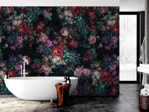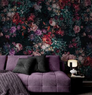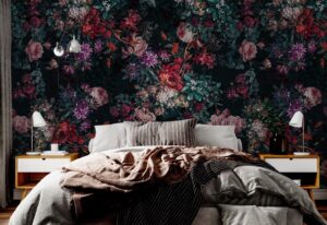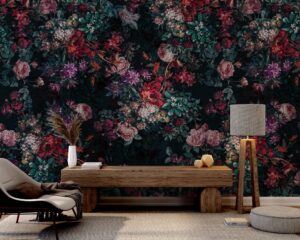 Koyu Zeminli Büyük Desenli Romantik Çiçek Duvar Kağıdı