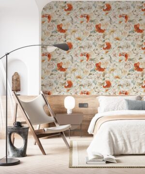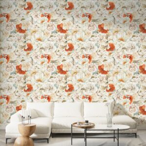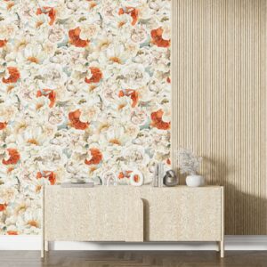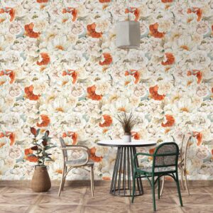 Geçmişin zarafetini modern yaşam alanlarınıza taşıyın! Bu büyüleyici krem, bej ve sıcak kiremit tonlarındaki büyük çiçek desenli vintage duvar kağıdı, duvarlarınıza sanatsal bir derinlik ve nostaljik bir hava katacak. Dolgun şakayıkları andıran çiçek motifleri ve yumuşak geçişli renk paleti ile mekanınıza sıcaklık ve sofistike bir karakter kazandırın.
