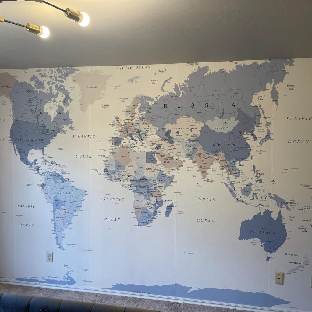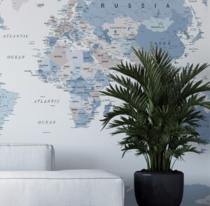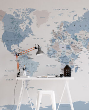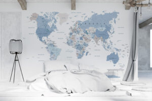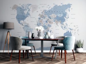 Mavi ve gri tonlarının sakin kombinasyonuyla tasarlanan bu minimal dünya haritası duvar kağıdı, modern dekorasyon anlayışını tamamlar. Detaylı ülke sınırları ve okunaklı yazılar yüksek çözünürlüklü UV baskı teknolojisiyle üretilir.