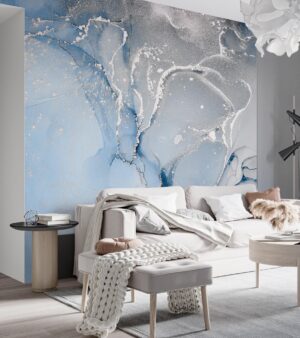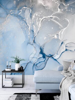 Mavi ve Gümüş Akışkan Soyut Desenli Lüks Duvar Kağıdı