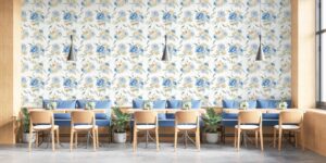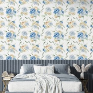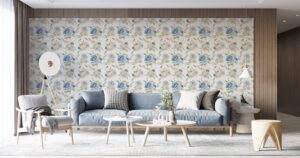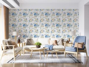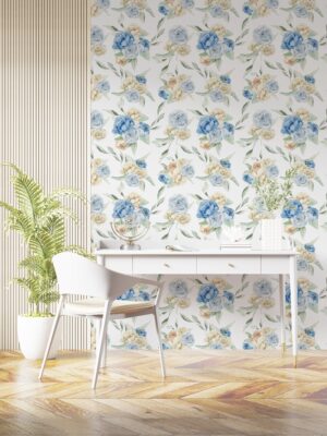 Yaşam alanlarınıza huzur ve zarafet katacak bu eşsiz mavi ve krem rengi çiçek desenli duvar kağıdı ile tanışın. Suluboya tekniğinin naif dokunuşlarıyla bezenmiş mavi, pastel sarı ve krem tonlarındaki çiçekler, taze yeşil yapraklarla birleşerek duvarlarınızda aydınlık ve dingin bir atmosfer yaratır. Bu desen, mekanınıza hem klasik bir şıklık hem de modern bir ferahlık sunar.