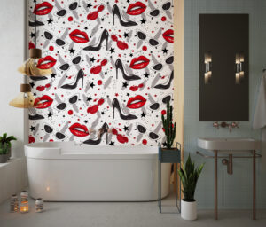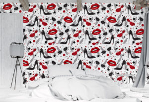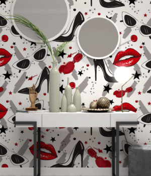 Bu çarpıcı moda temalı duvar kağıdı, kırmızı rujlar, topuklu ayakkabılar ve gözlük figürleriyle cesur ve şık bir tarz yaratır.