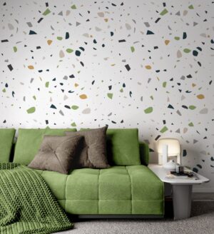 Bu modern terrazzo desenli duvar kağıdı, beyaz zemin üzerindeki yeşil, gri, siyah ve bej tonlarındaki renk parçacıklarıyla çalışma odası, ofis veya oturma odası gibi alanlara şık bir dinamizm katıyor. Minimalist dekorasyon sevenler için mükemmel bir seçimdir. Kendinden yapışkanlı veya geleneksel tutkal uygulamalı seçenekleriyle sunulmaktadır.