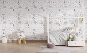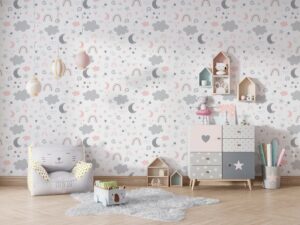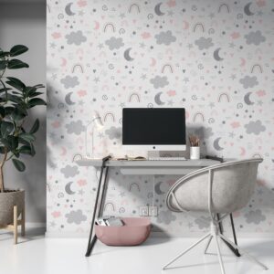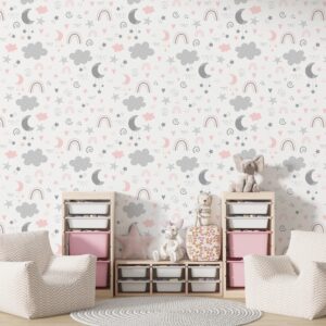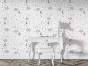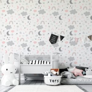 Çocuğunuzun odasına hayal gücünü besleyen, sevimli ve huzurlu bir atmosfer katın! Bu özel tasarım çocuk duvar kağıdı, pastel renklerdeki sevimli bulutlar, uyuyan aydedeler, minik gökkuşakları ve parlayan yıldız desenleriyle dolu. Gri, pembe ve bej tonlarının hakim olduğu yumuşak renk paleti, hem kız hem de erkek çocuk odaları için sakinleştirici, modern ve İskandinav tarzı bir görünüm sunar. Bu eğlenceli desenler, miniklerin odasında oyun ve uyku zamanlarını daha keyifli hale getirecektir.