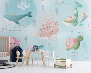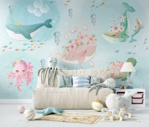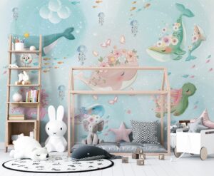 Çiçeklerle süslenmiş balinalar, ahtapotlar ve deniz kaplumbağalarının yer aldığı bu pastel tonlardaki su altı temalı duvar kağıdı, bebek ve çocuk odalarına masalsı bir hava katıyor. Yumuşak mavi arka planı ve detaylı illüstrasyonlarıyla rahatlatıcı ve ilham verici bir ortam sunar. Ürün, hem kendinden yapışkanlı hem de geleneksel tutkal ile uygulanabilir seçeneklerde sunulmaktadır. Bebek odaları, çocuk odaları ve oyun alanları için mükemmel bir tercihtir.