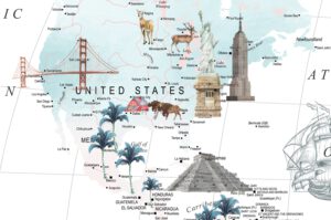 Mavi Arka Planlı Hayvanlı ve Anıtlı Dünya Haritası Duvar Kağıdı
