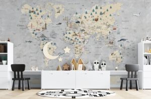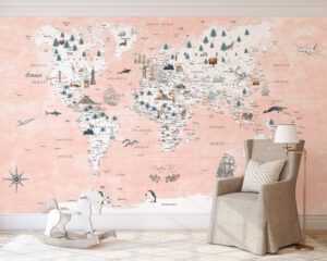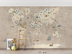 Pastel mavi ve pembe tonlarıyla tasarlanmış bu hayvanlı dünya haritası duvar kağıdı, çocuk odalarına ve oyun alanlarına hem modern hem de eğitici bir atmosfer kazandırır. Üzerinde dünya üzerindeki önemli hayvan türleri ve anıtlar detaylı bir şekilde gösterilmektedir. Kendinden yapışkanlı vinil veya geleneksel tutkallı uygulama seçenekleri ile kolayca monte edilir. Yüksek çözünürlüklü baskı kalitesine sahiptir ve özel ölçü seçenekleri sunulmaktadır.