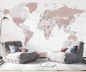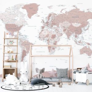 Dünyayı keşfetme merakını ve öğrenme isteğini duvarlarınıza taşıyan bu zarif ve detaylı dünya haritası duvar kağıdı ile tanışın. Pastel ve yumuşak toprak tonlarındaki (bej ve hafif gül kurusu esintili) kıtalar, ferah beyaz bir zemin üzerinde modern ve sakin bir estetik sunar. Ülke sınırları, başkentler ve önemli şehirlerin yanı sıra okyanusların ve denizlerin isimleriyle zenginleştirilmiş bu eğitici tasarım, özellikle çocuk ve genç odaları için hem dekoratif bir şıklık katar hem de coğrafya bilgilerini eğlenceli bir şekilde pekiştirir. Aynı zamanda çalışma odaları, kütüphaneler veya modern minimalist tarzda dekore edilmiş yaşam alanları için de ilham verici ve sofistike bir atmosfer yaratır. Duvar ölçülerinize özel olarak üretilen bu duvar kağıdını, pratik kendinden yapışkanlı, zengin dokulu veya şık deri desenli olmak üzere üç farklı malzeme seçeneğiyle sipariş edebilirsiniz. Greenguard Gold sertifikalı, kokusuz ve su bazlı reçine mürekkeplerle basılan tüm ürünlerimiz, çocuklarınızın ve sizin sağlığınız için güvenli, çevre dostu bir seçimdir. Bu harita ile minik kaşiflerin hayal gücünü besleyin ve evinize eğitici bir dokunuş katın.