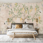 Çiçekli Ağaç ve Kuşlar Desenli Duvar Kağıdı