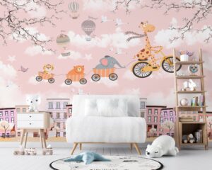 Uçan bisikletli zürafa ve sevimli hayvanlar temalı bu pembe gökyüzü duvar kağıdı, bebek ve çocuk odalarına neşe ve hayal gücü katmak için tasarlandı. Renkli ve eğlenceli detaylarla çocukların ilgisini çekerken, mekanlara sıcak bir atmosfer sunar. Kendinden yapışkanlı ve tutkallı seçenekleriyle kolayca uygulanabilir.