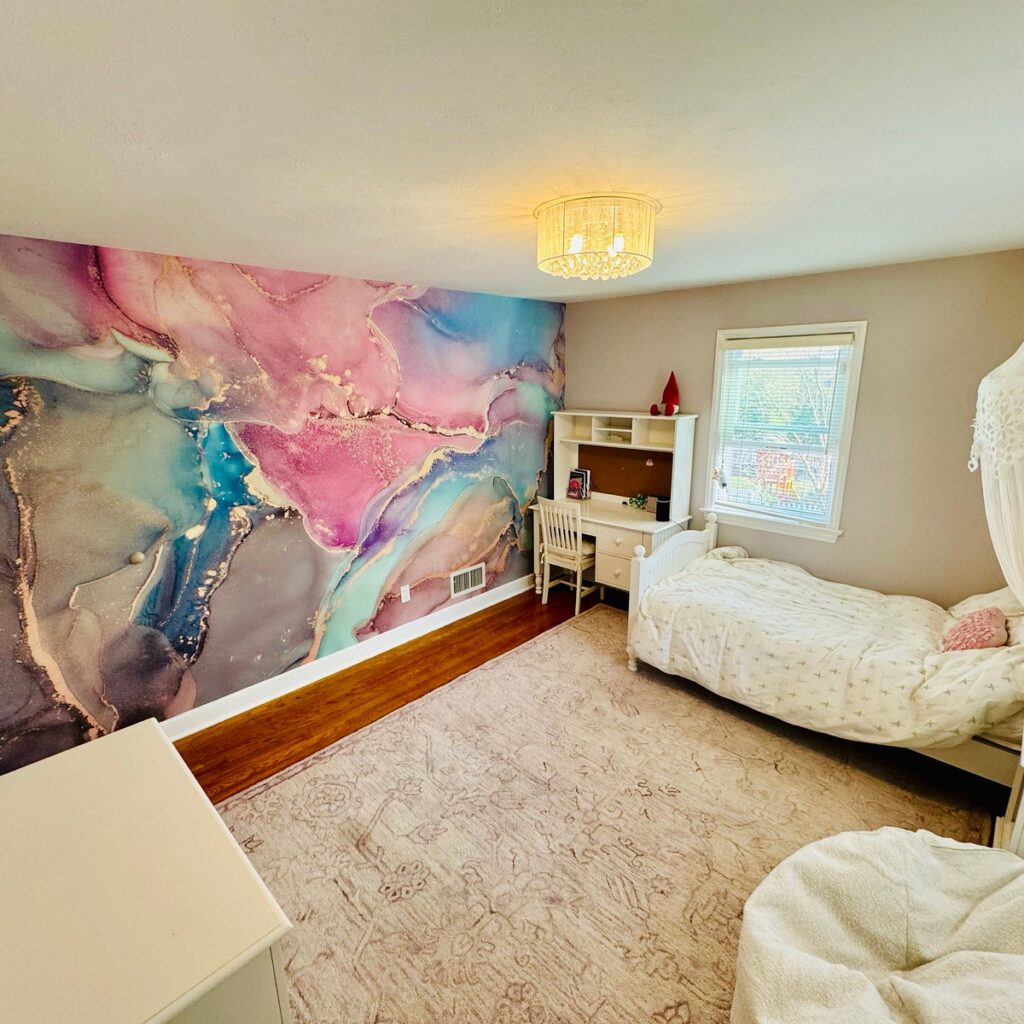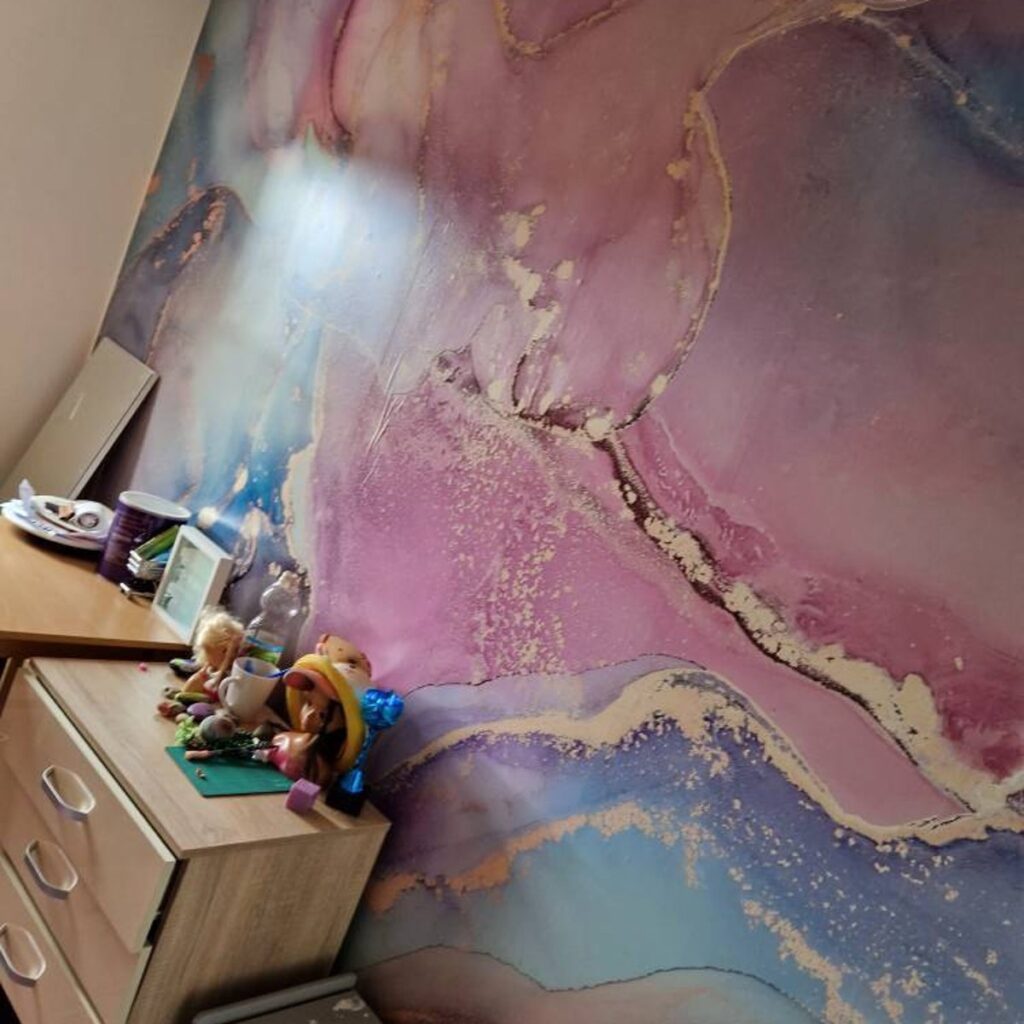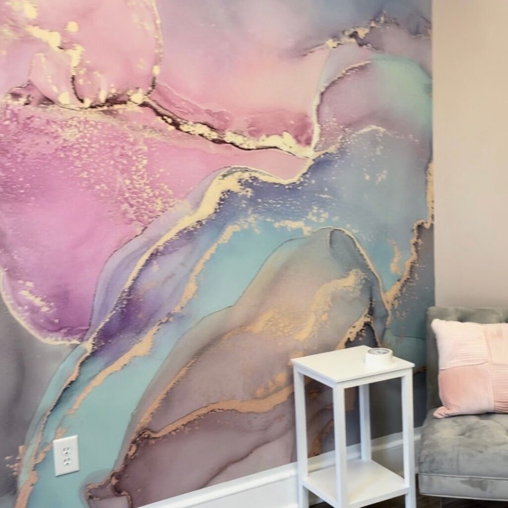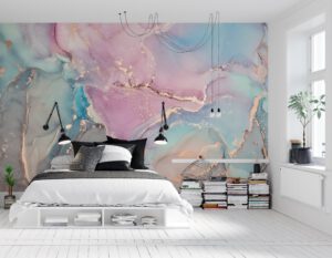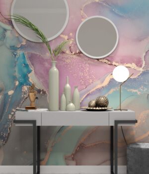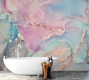 Pembe ve mavi tonlarında abstrakt mermer desenli duvar kağıdı, banyonuza zarif bir atmosfer katar. Altın vurgularla lüks bir görünüm elde edin.