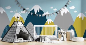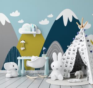 Çocuk odalarına neşe katan renkli dağlar ve bulutlar desenli duvar kağıdı, modern ve minimalist bir tarzda tasarlanmıştır. Kendinden yapışkanlı veya geleneksel tutkal ile kolayca uygulanabilir.
