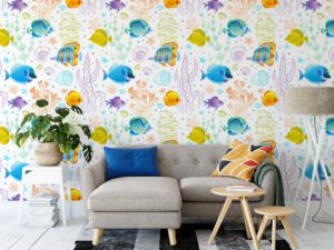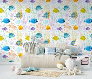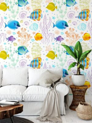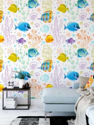Deniz balıkları, deniz yıldızları, mercanlar ve kabuklarla tasarlanmış bu canlı ve renkli duvar kağıdı, çocuk ve oyun odalarına eğlenceli ve enerjik bir atmosfer katıyor. Pastel tonlardaki balık ve deniz canlıları detaylı çizimlerle sunuluyor. Hem kendinden yapışkanlı hem de geleneksel tutkal ile uygulanabilir seçeneklerde sunulmaktadır. Özellikle çocuk odaları ve oyun alanları için mükemmel bir tercihtir.