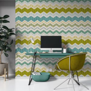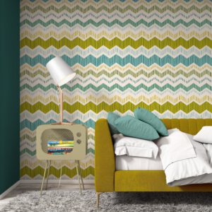 Yeşil, mavi ve hardal tonlarında dalgalı çizgi desenleriyle tasarlanan bu retro-modern duvar kağıdı, yaşam alanlarınıza enerji ve derinlik katıyor.
