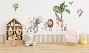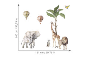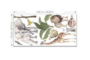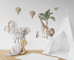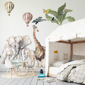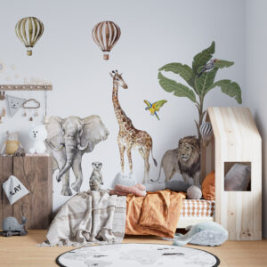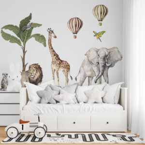 Çocuğunuzun odasını büyülü bir safari macerasına dönüştürün! Bu özel tasarlanmış duvar sticker seti, fil, aslan, zürafa, meerkat ve renkli papağan figürleriyle birlikte egzotik palmiye ağacı ve nostaljik sıcak hava balonları içermektedir.