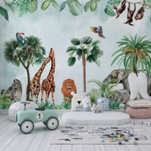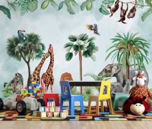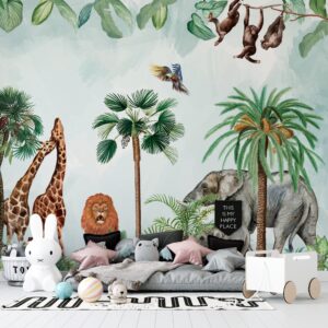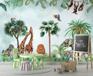Zürafa, fil, aslan, zebra ve maymun gibi safari hayvanlarıyla süslenmiş bu canlı ve eğlenceli duvar kağıdı, çocuk odalarına ve oyun alanlarına macera dolu bir atmosfer katıyor. Tropikal ağaçlar ve parlak renk detayları ile mekanlara enerji ve neşe getirir. Ürün hem kendinden yapışkanlı hem de geleneksel tutkal ile uygulanabilir seçeneklerde sunulmaktadır. Çocuk odaları, oyun odaları ve kreşler için mükemmel bir tercihtir.