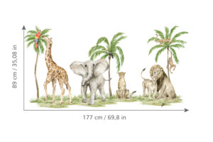 Sevimli safari hayvanları temalı bu özel tasarım duvar sticker seti ile çocuklarınızın odasına eğlenceli ve macera dolu bir atmosfer katın! Zürafa, fil, aslan ailesi, leopar ve maymun gibi en sevilen hayvan figürlerinin yer aldığı bu set, miniklerin hayal gücünü geliştirmek için özenle tasarlanmıştır.