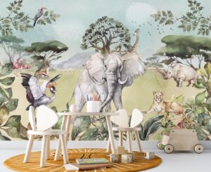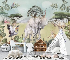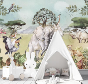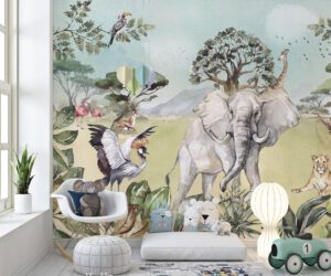 Aslanlar, filler, zürafalar, rhinolar ve flamingolar gibi safari hayvanlarıyla tasarlanmış bu doğal yaşam temalı duvar kağıdı, çocuk odalarına ve oyun alanlarına huzurlu ve doğal bir atmosfer katıyor. Su renkleriyle yapılan illüstrasyonlar ve pastel tonlar, doğayı odalarda hissettiriyor. Hem kendinden yapışkanlı hem de geleneksel tutkal ile uygulanabilir seçeneklerde sunulmaktadır.
