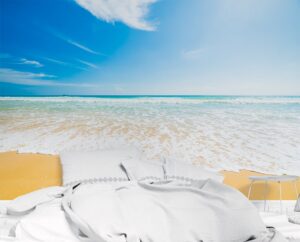 Sahil manzaralı bu duvar kağıdı, odanıza huzurlu ve ferah bir atmosfer katıyor. Mavi okyanus ve kumsal tasarımıyla, modern dekorasyonunuza mükemmel uyum sağlar. Doğal deniz manzarası, iç mekanınıza rahatlatıcı ve taze bir hava getirir.