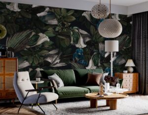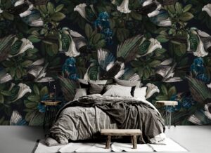 Duvarlarınıza sanatsal bir dokunuş ve dramatik bir hava katın! Bu göz alıcı tasarım, koyu bir zemin üzerinde süzülen saksağan kuşları, zarif beyaz borazan çiçekleri, mavi iris dokunuşları ve canlı yeşil yapraklarla bezenmiştir. Maksimalist ve vintage esintiler taşıyan bu duvar kağıdı, mekanınıza sofistike ve derin bir karakter kazandırır. Kendinden yapışkanlı, dokulu veya deri desenli malzeme seçeneklerimizle duvarlarınıza kolayca uygulayabilirsiniz. Dilediğiniz ölçülerde, tamamen size özel olarak üretilir. Greenguard Gold sertifikalı, kokusuz ve su bazlı reçine mürekkeplerimizle hem sağlıklı hem de uzun ömürlü bir dekorasyon deneyimi sunuyoruz. Salonunuzda, yatak odanızda veya etkileyici bir giriş holünde odak noktası yaratmak için mükemmeldir.