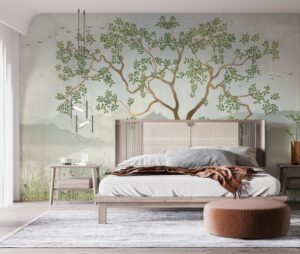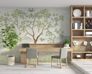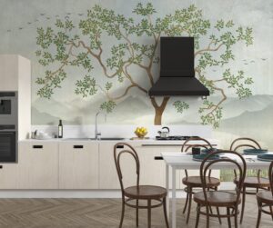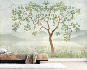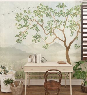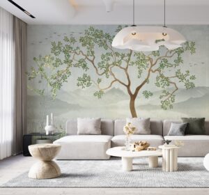 Sanatsal Ağaç ve Dağ Manzaralı Duvar Kağıdı Muralı