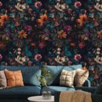 Koyu Zemin Kırmızı & Krem Çiçekli Botanik Duvar Kağıdı