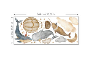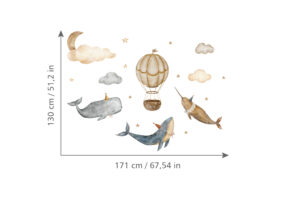 - Tasarım: Hayal gücünü geliştiren, rüya gibi, vintage suluboya tarzında, parti şapkalı balinalar, narval, uçan balon, bulut, yıldız ve ay teması