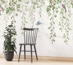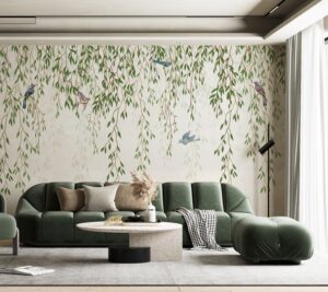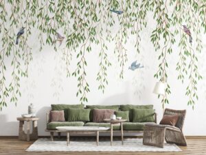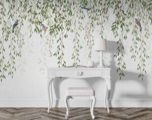 Evinize doğanın dinginliğini ve zarafetini taşıyın! Bu göz alıcı duvar kağıdı, nazikçe sarkan yeşil yapraklar ve aralarına serpiştirilmiş sevimli minik kuşlarla mekanlarınıza ferah ve huzurlu bir atmosfer katacak. Minimalist ve şık çizgileriyle modern yaşam alanlarından yatak odalarına kadar pek çok farklı dekora uyum sağlar, duvarlarınıza sanatsal bir dokunuş ekler.