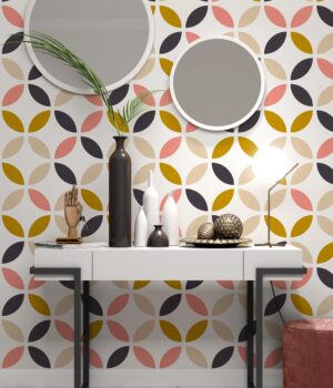 Bu modern retro tarzı duvar kağıdı, pembe, hardal sarısı, siyah ve krem tonlarıyla mekanlarınıza sıcak ve enerjik bir hava katıyor. Yatak odası, genç odası, oturma odası veya yaratıcı çalışma alanları için mükemmel bir tercihtir. Kendinden yapışkanlı veya geleneksel tutkal uygulamalı seçeneklerle sunulmaktadır.