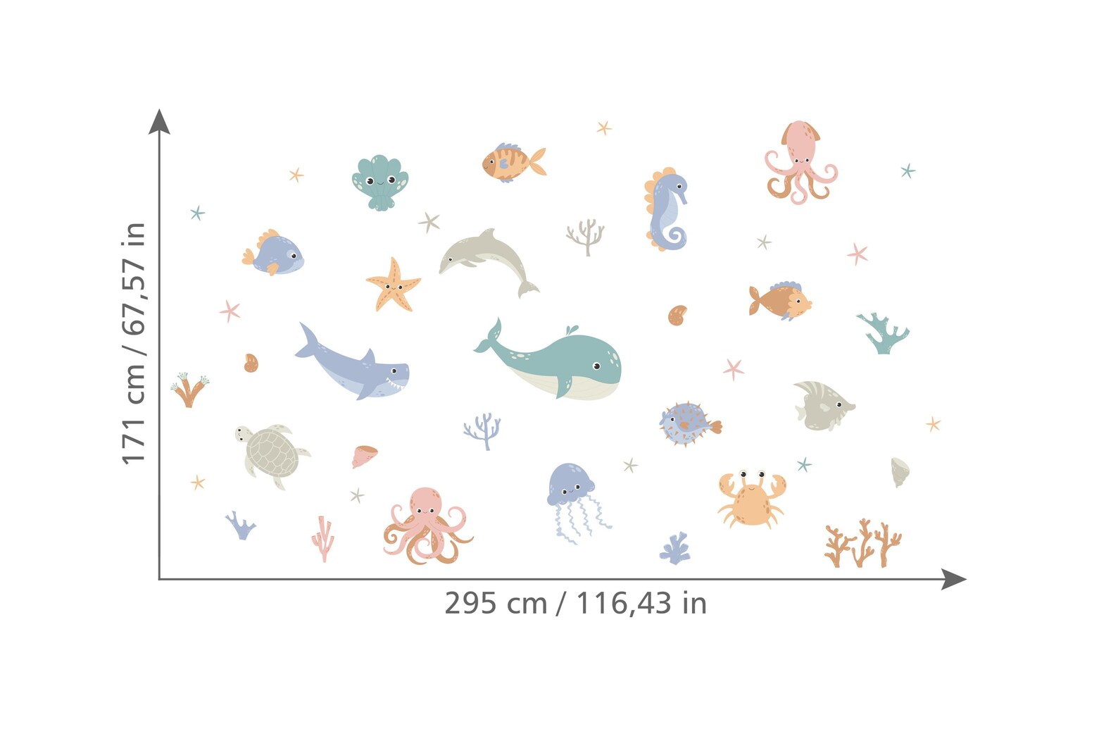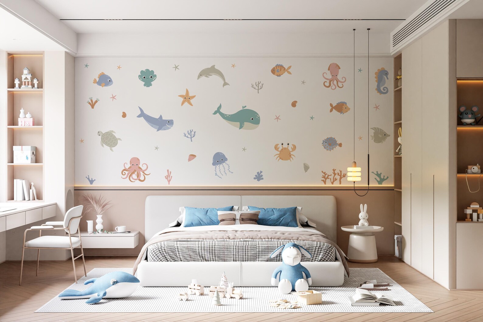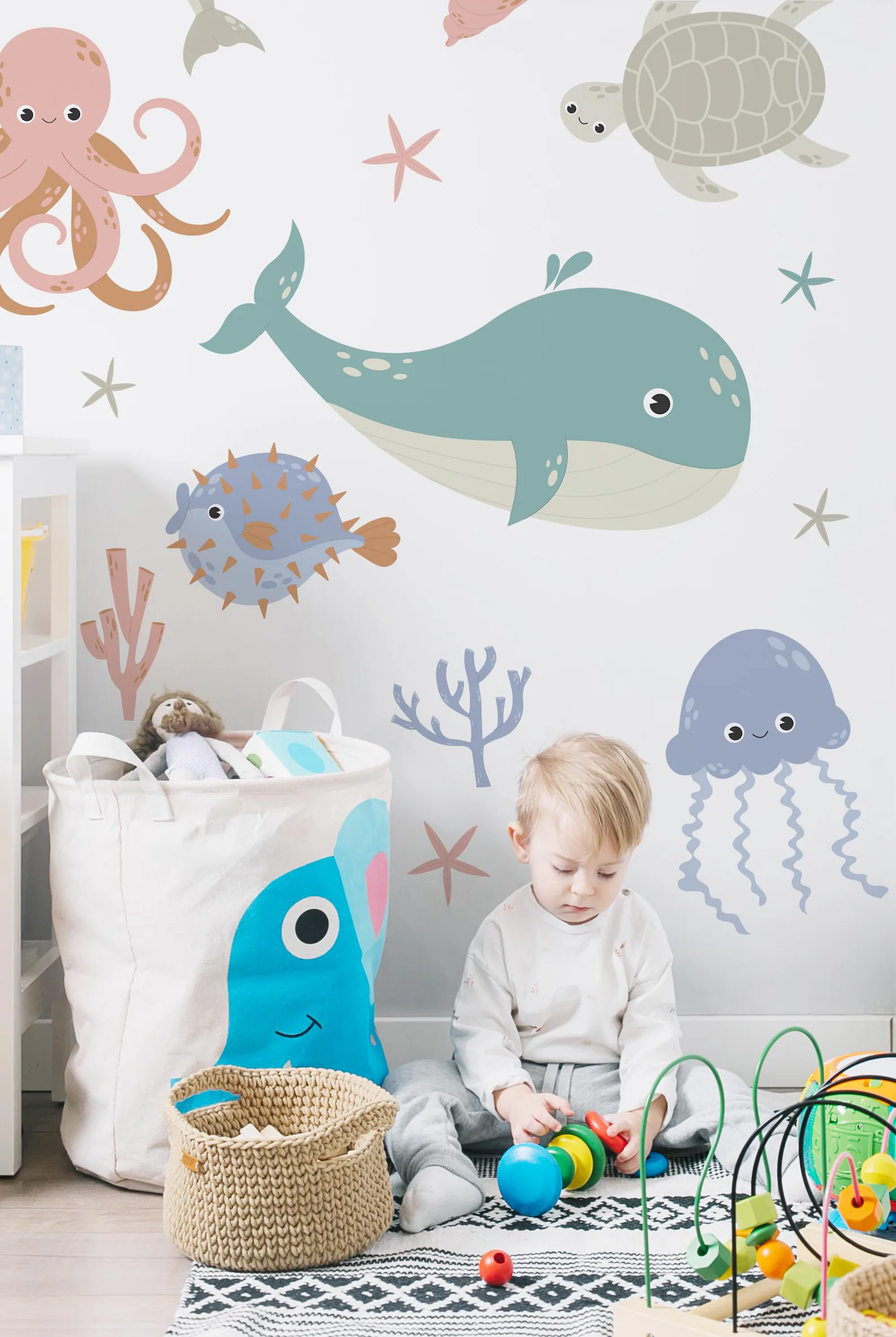 Gülümseyen balina, sevimli ahtapot, bilge kaplumbağa ve diğer neşeli deniz canlılarından oluşan bu set, soft renkleri ve modern tasarımıyla özellikle bebek ve çocuk odaları için sakinleştirici ve hayal gücünü besleyen bir ortam yaratır.