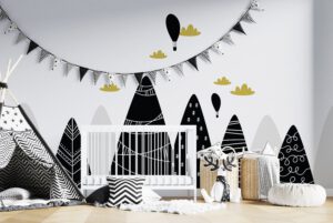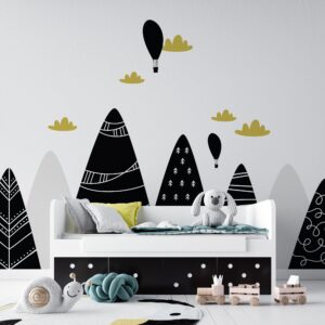 Bu şık siyah beyaz dağlar, sıcak hava balonları ve bulutlar duvar kağıdı, modern bir çocuk odası için mükemmel bir seçenek. Minimalist çizgiler ve renk blokları ile odanıza zarif ve modern bir hava katacak. Kendinden yapışkanlı veya geleneksel uygulama seçenekleriyle sunulmaktadır.