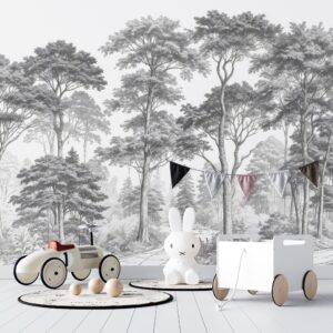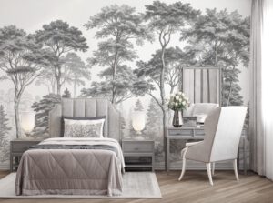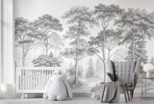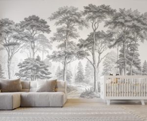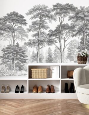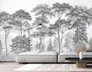 Sakinleştirici bir doğa hissi yaratmak isteyenler için bu siyah beyaz orman temalı duvar kağıdı mükemmel bir tercihtir.